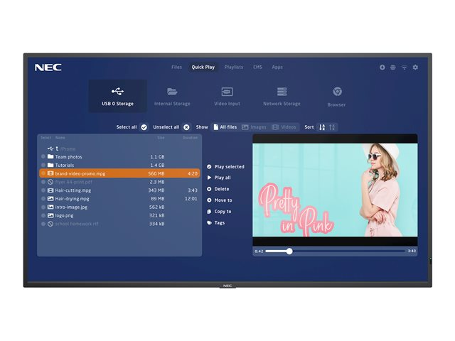 | Egenskaper | ARC (Aspect Ratio Control), säkerhetslåsuttag (kabellås säljs separat), atomatiskt larm vid e-post, Crestron Connected Compatible, NaViSet Administrator 2, AMX NetLinx support, PJLink, utformad för användning 24/7, ASCII Control Commands, avtagbar logo, funktion som gör vit kopia, fabrikskalibrerad gamma, fabrikskalibrerad intensitet, fabrikskalibrerad RGB, fabrikskalibrerad enhetlighet, fabrikskalibrerad vit punkt, CEC Support, kompatibel med Raspberry Pi Compute Module 4, schemalagd timer |