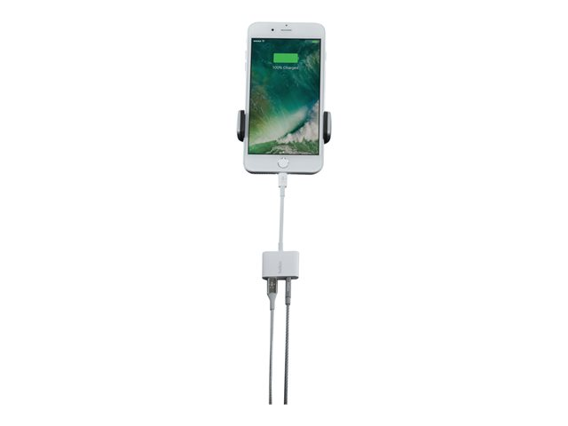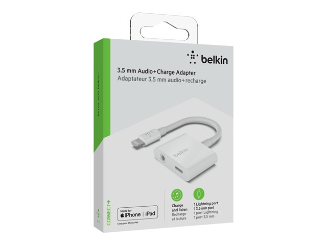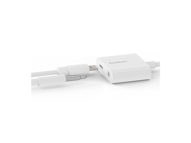 Belkin 3.5 mm Audio + Charge RockStar - Lightning- till hörlursjack/laddningsadapter - Lightning hane till Lightning, 4-poligt minijack hona - vit