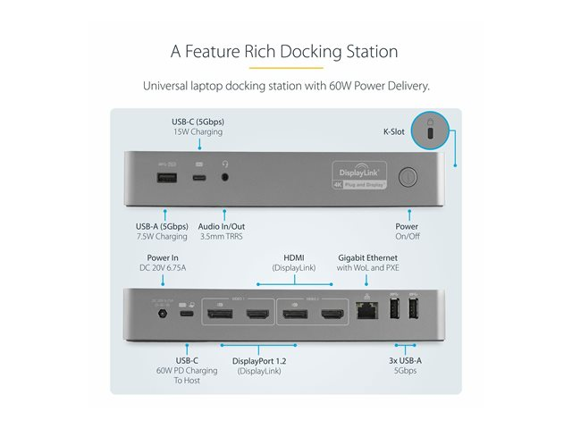 StarTech.com USB-C- och USB-A-dockningsstation - hybrid universell dockningsstation för bärbar dator med dubbelskärm för 4K vid 60 Hz samt HDMI och DisplayPort - USB 3.1 Gen 1-hubb, GbE - strömförsörjning på 60 W - Windows, Mac och Chrome - dockningsstation - USB-C - 2 x HDMI, 2 x DP - 1GbE